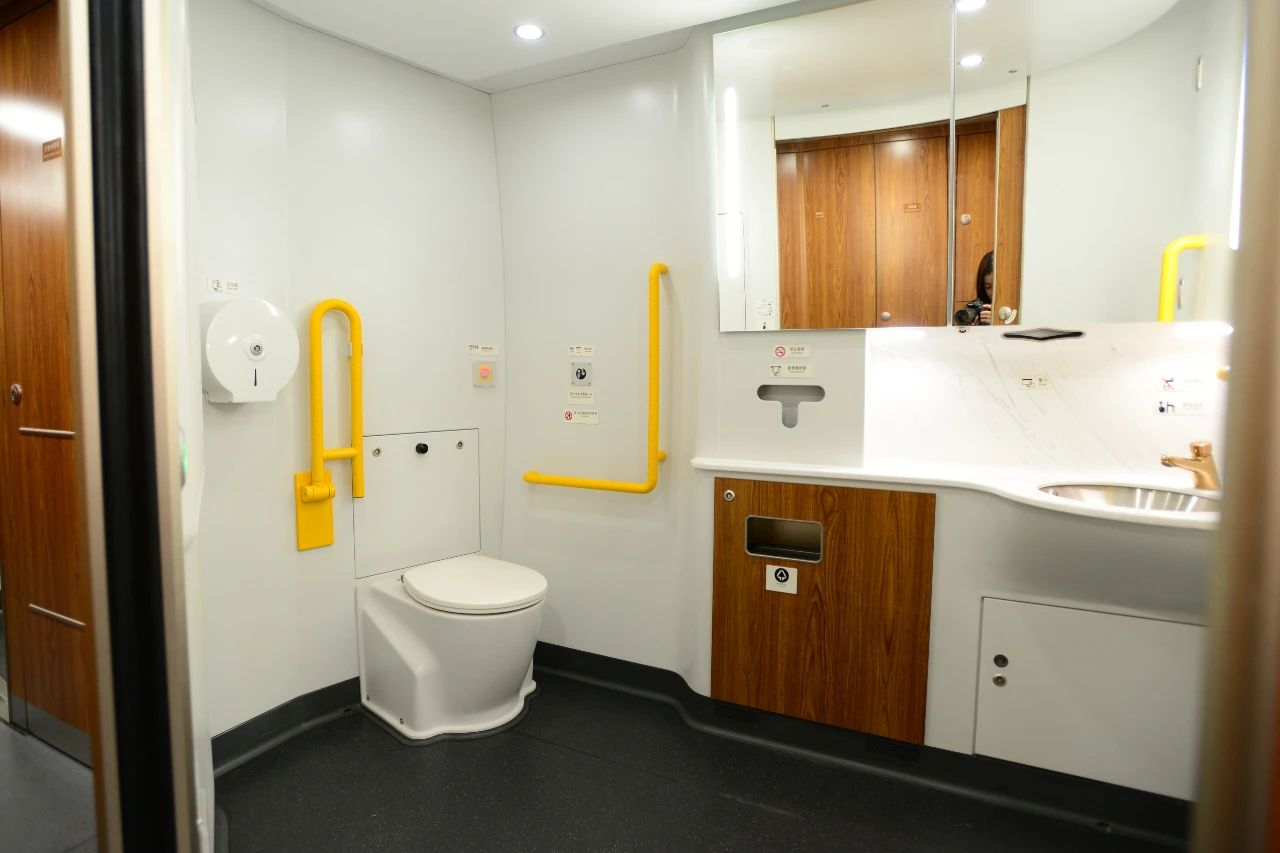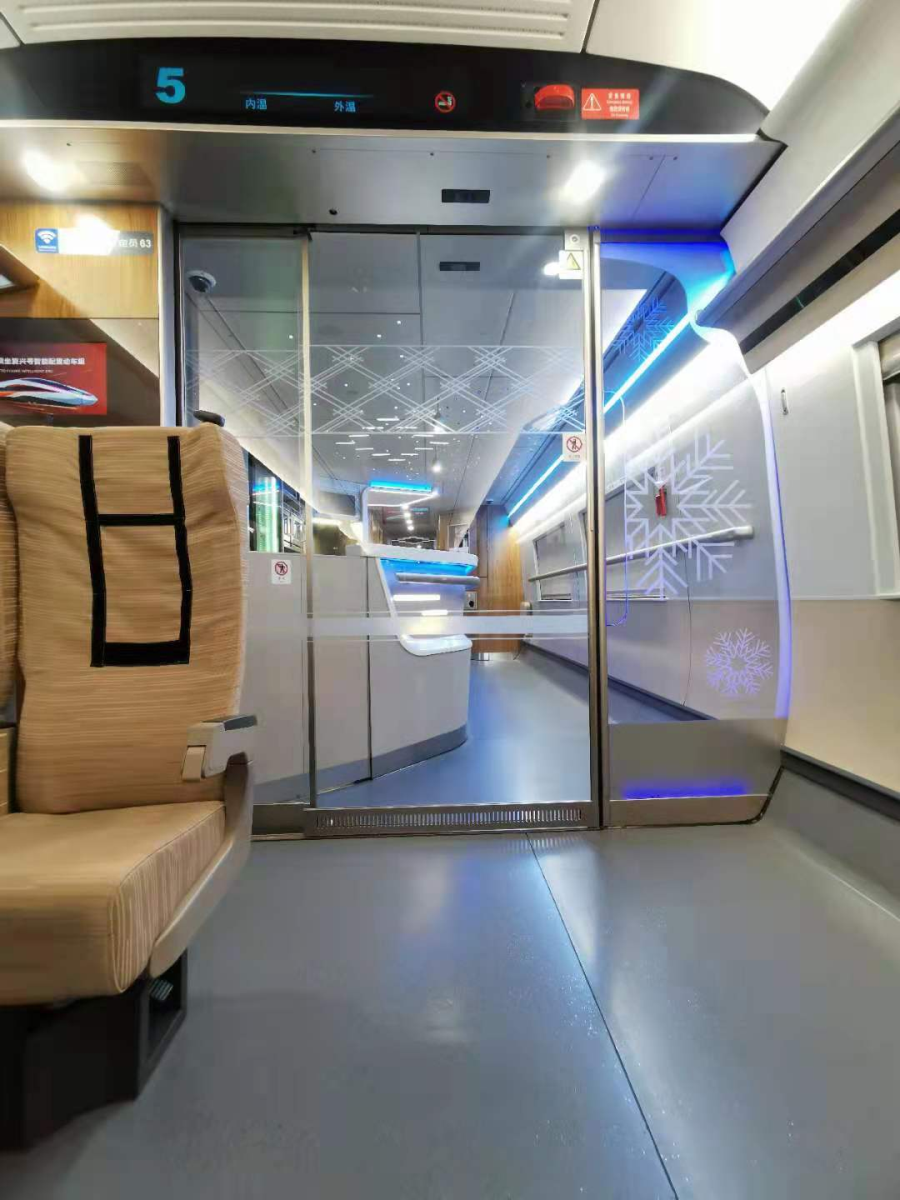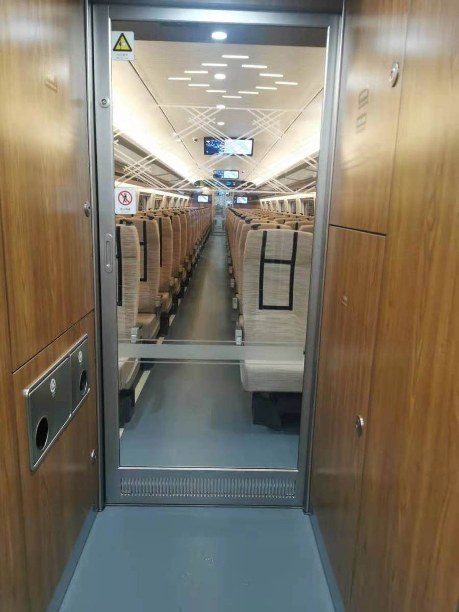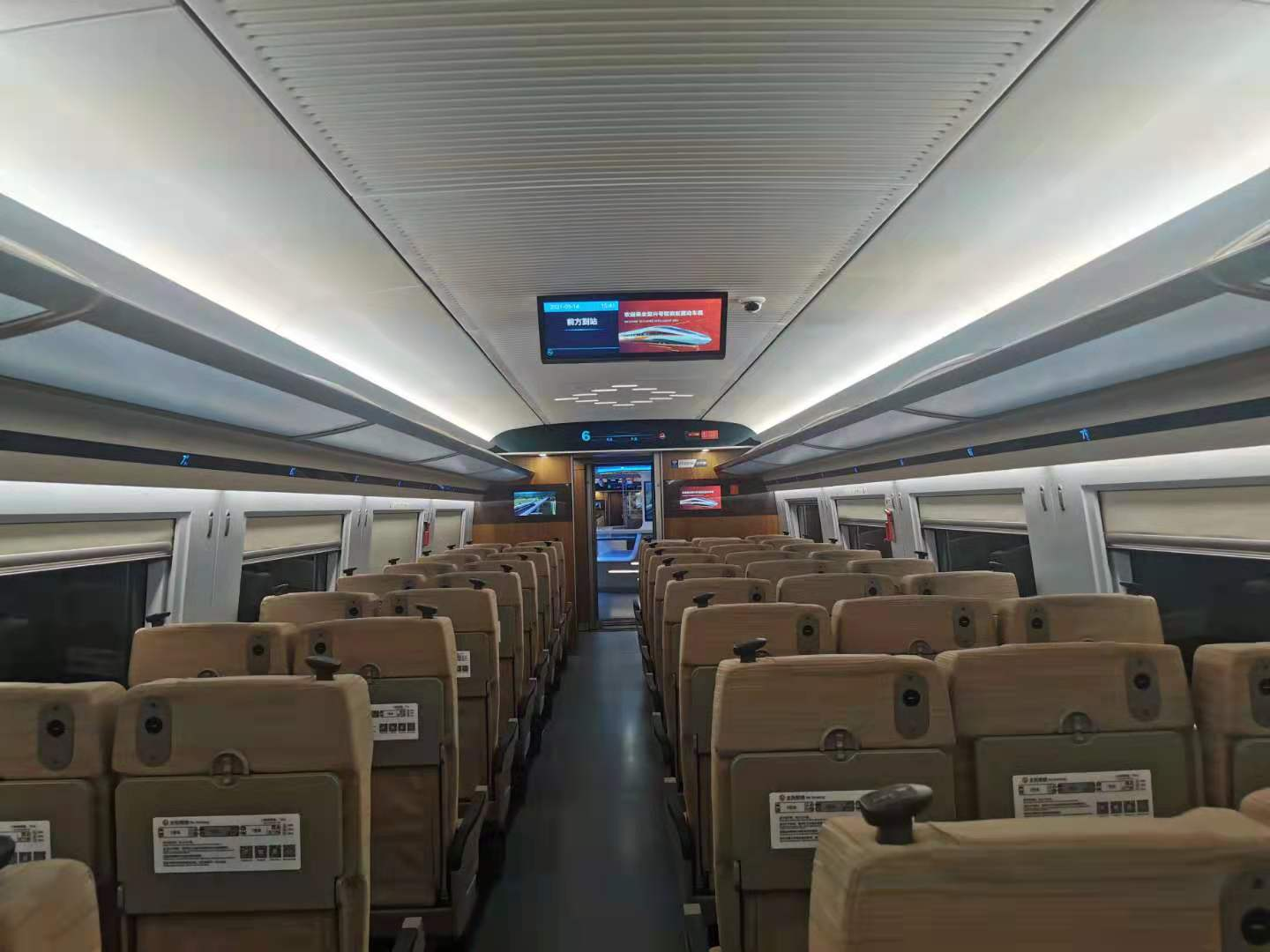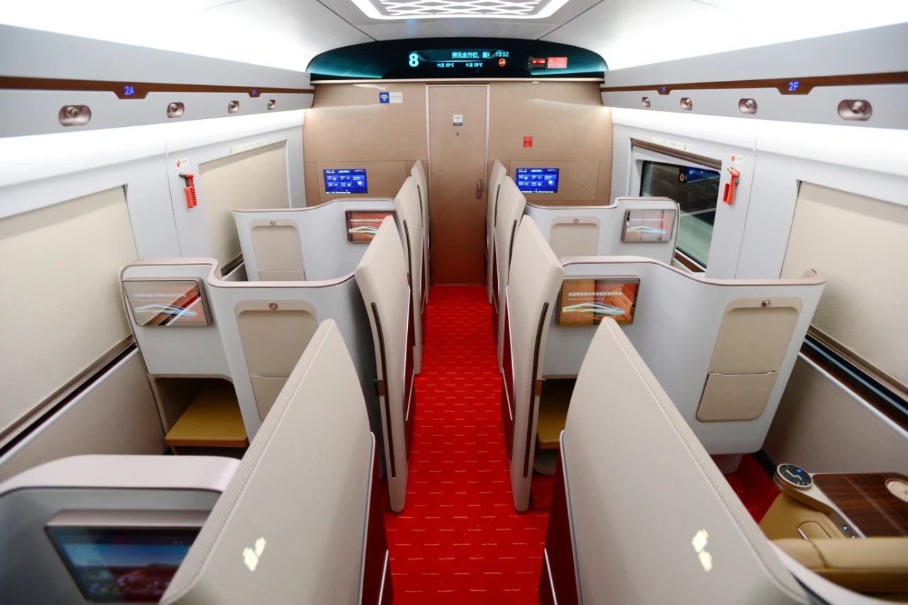 进入车厢内部,商务舱座椅采用包厢式设计,过道两侧设置半高隔断和内藏式拉门,打造“一人一舱”的私密空间。座椅具备坐姿、半躺、平躺三种姿态的自动调节和一键复位功能,同时搭配柔性臂阅读灯,手机无线充电、降噪耳机,小件物品存放区等诸多设施,提供温馨便捷的服务。同时配备支持手机投屏功能的智能交互终端,可为旅客提供丰富的娱乐节目、运行信息等服务,将工作与休闲有机结合。